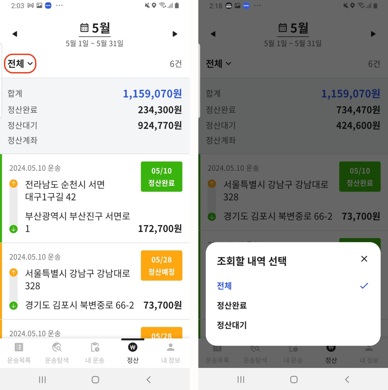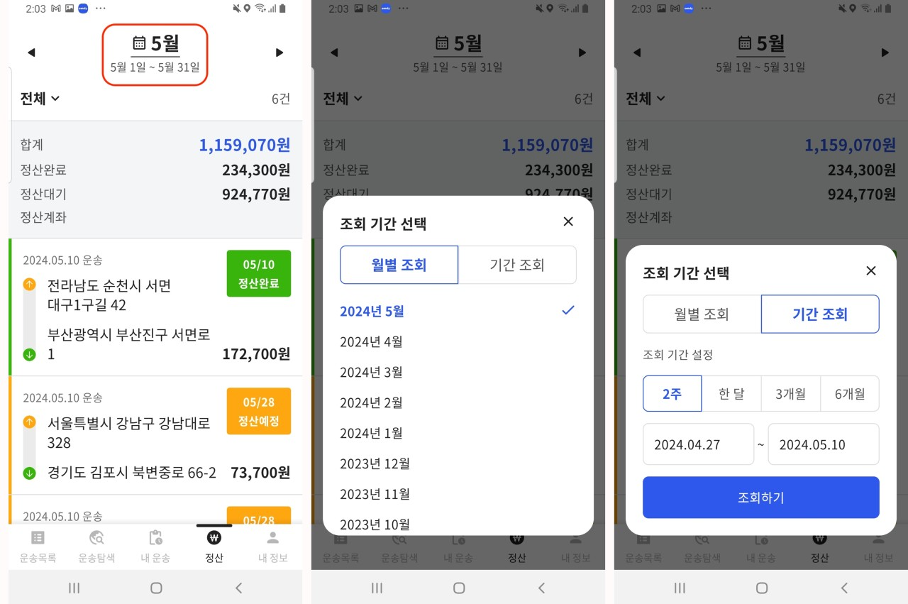 많은 드라이버 분들께서 요청 주셨던 기능으로, 특정 운송 기간 동안의 정산금을 앱에서 조회하기 어려웠던 불편함을 개선하고자 합니다.