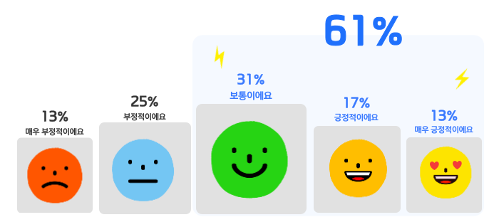 설문에 참여한 드라이버님들 중 61% 정도가 전기차에 대해 긍정적이거나 보통이라고 답하셨어요!