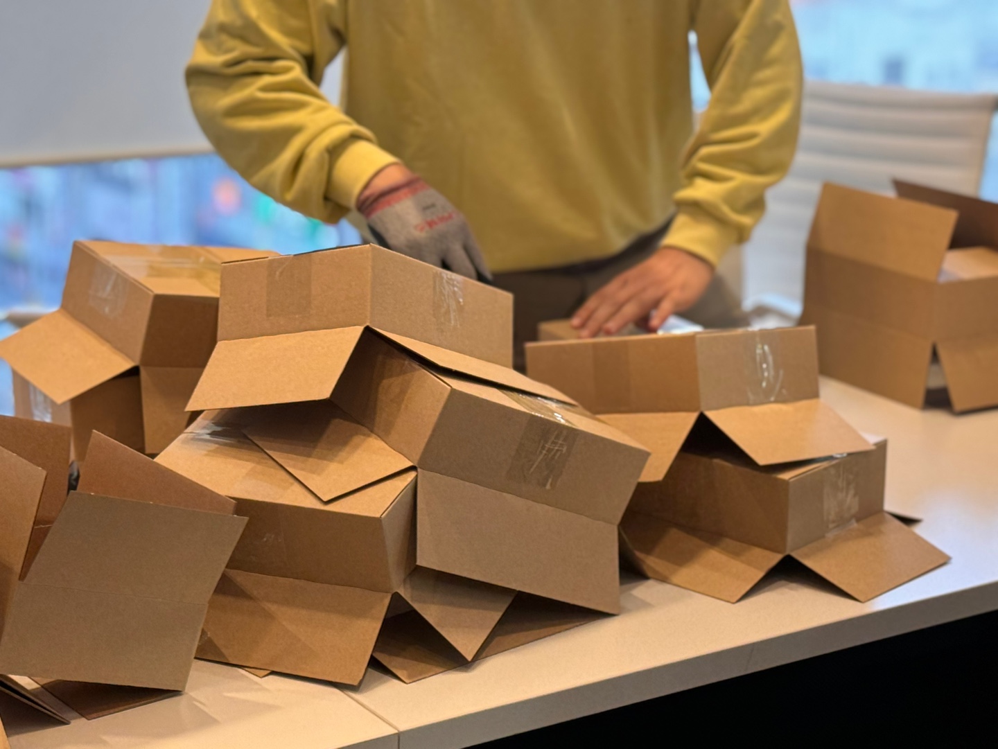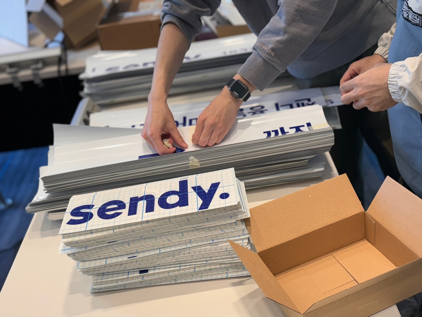 이제 센디 팀원들은 스티커 포장 달인이 되었습니다.