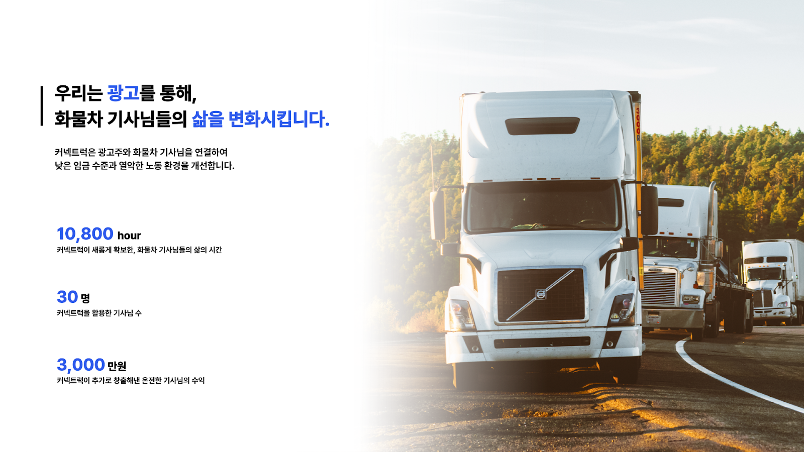 커넥트럭은 화물차 기사님과 광고주가 서로 윈윈할 수 있도록 돕는 플랫폼이에요.