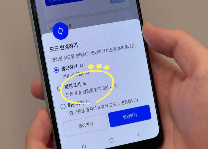 🟢출근 버튼을 클릭하면 모드 변경하기 화면이 나와요.