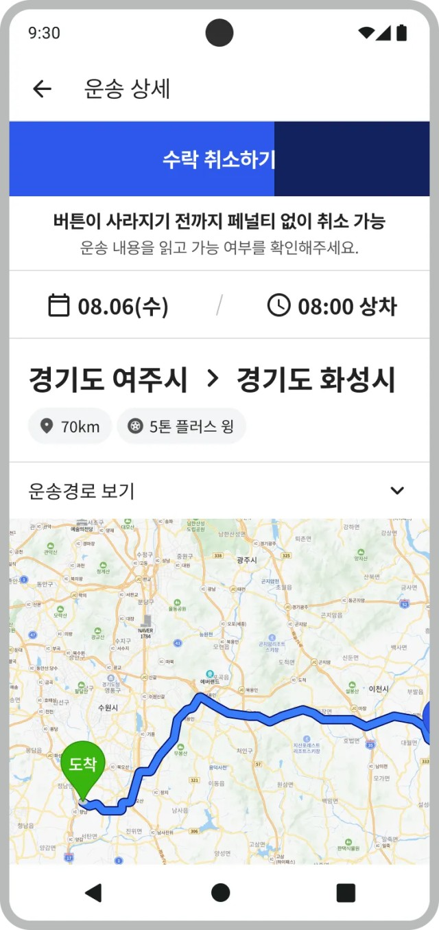 운송 수락 버튼을 누르면 30초동안 '수락 취소' 버튼이 맨 위에 보여져요.