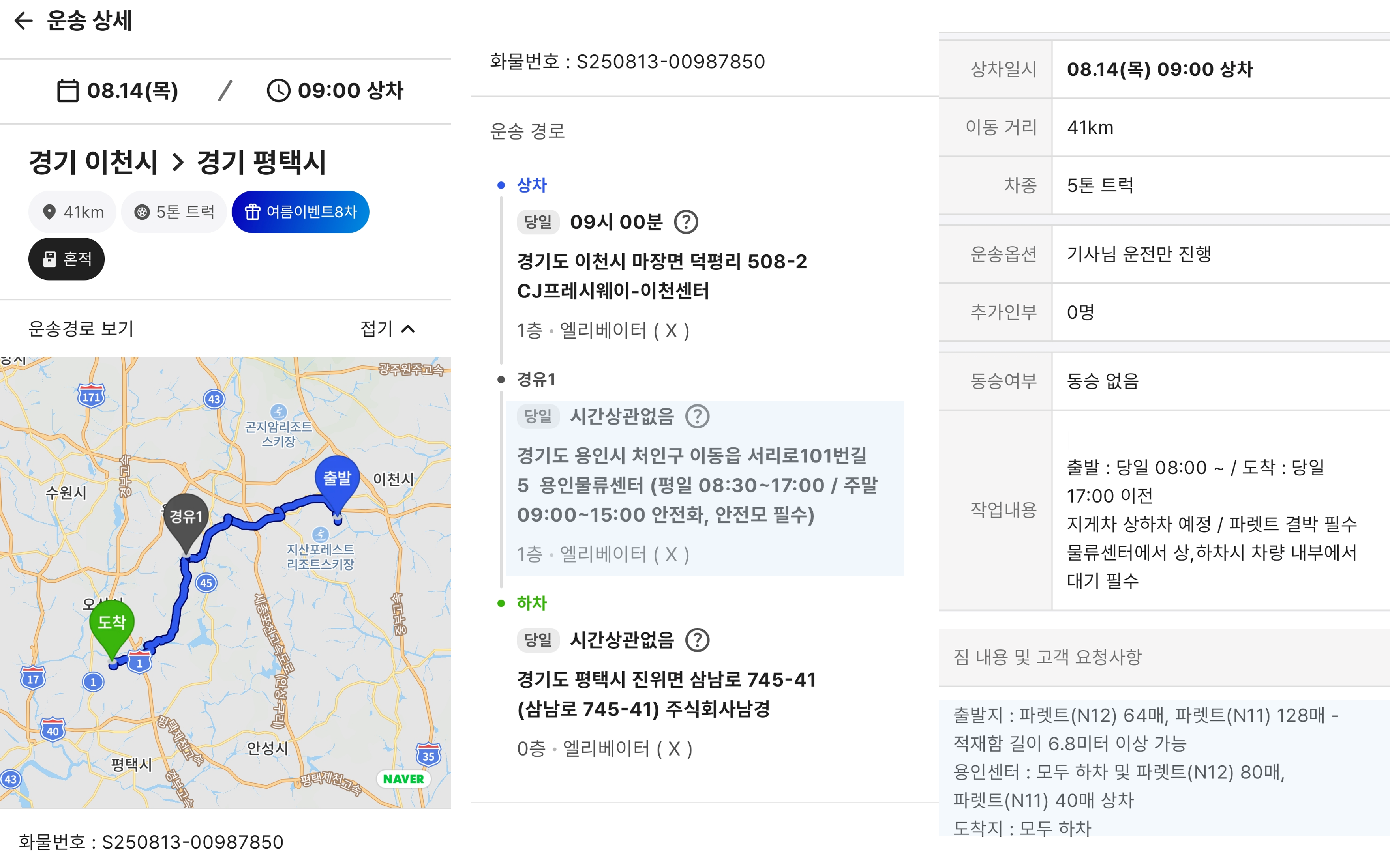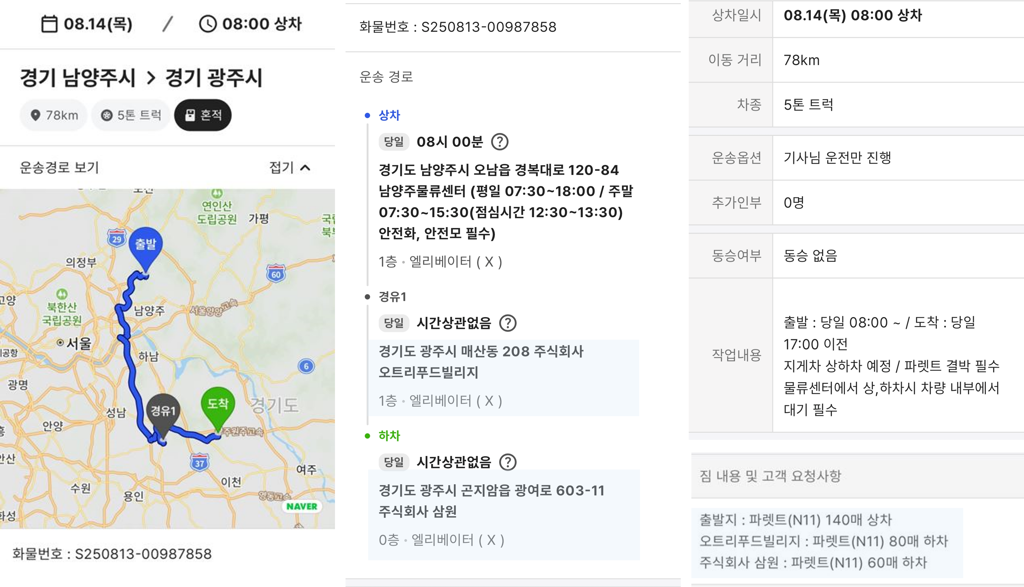 짐 내용에는 출발지와 경유지의 물품 정보를 확인해주세요. 어떤 물품을 하차한 후 두 번째로 상차하시는지 표시됩니다.