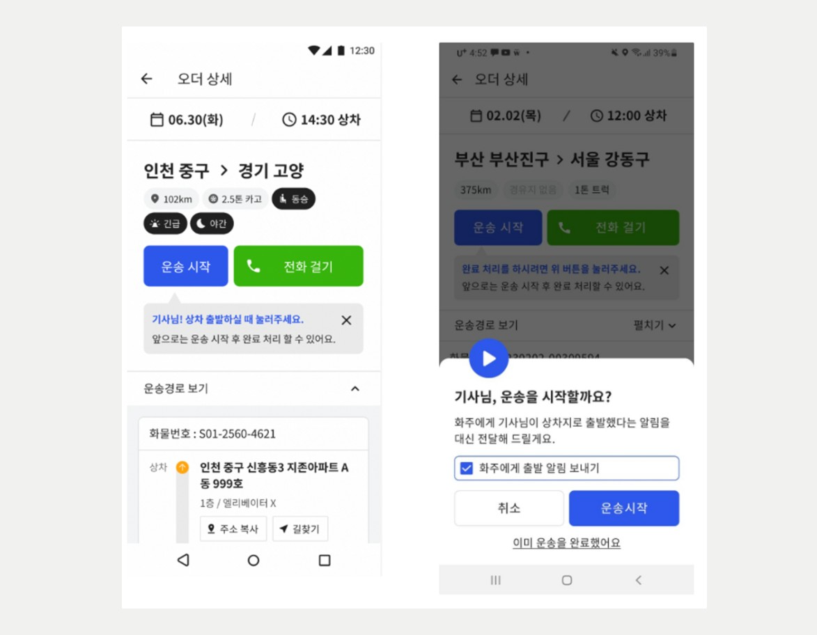 상차지로 출발하시기 전에 앱에서 '운송 시작' 버튼을 누르면, 사장님이 상차지로 출발했다는 알림을 고객에게 대신 전달해드립니다!