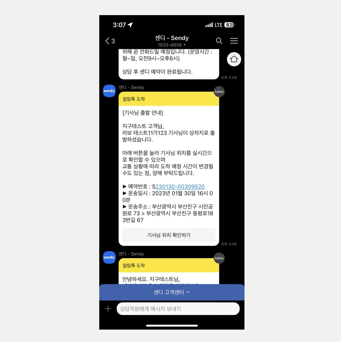 고객에게는 [기사님 출발 안내] 알림톡이 발송됩니다.