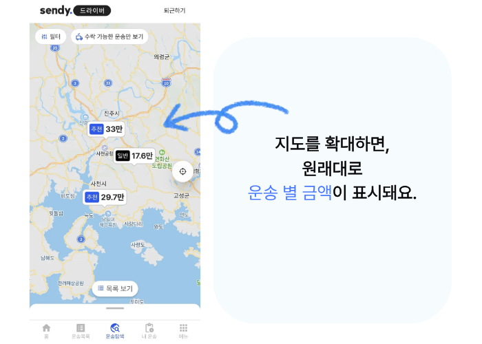 센디 드라이버님들 중 많은 분들이 운송 지도를 활용해 운송을 수락하고 계세요. 🗺️