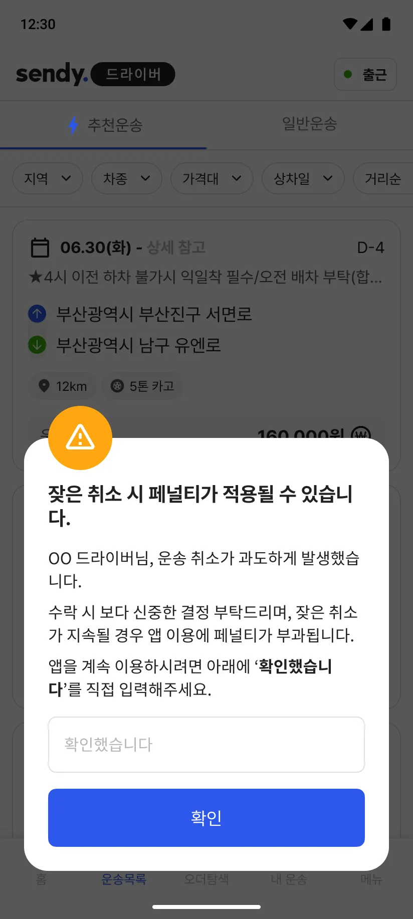 센디는 모든 드라이버님이 공정하고 안정적인 환경에서 운송하실 수 있도록 지속적으로 시스템을 개선하고 있습니다.