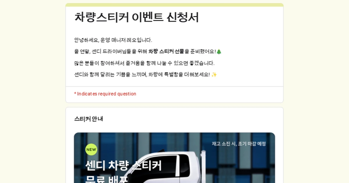 안녕하세요, 운영 매니저 레오입니다. 올 연말, 센디 드라이버님들을 위해 차량 스티커 선물을 준비했어요!🎄 많은 분들이 참여하셔서 즐거움을 함께 나눌 수 있으면 좋겠습니다. 센디와 함께 달리는 기쁨을 느끼며, 차량에 특별함을 더해보세요! ✨
