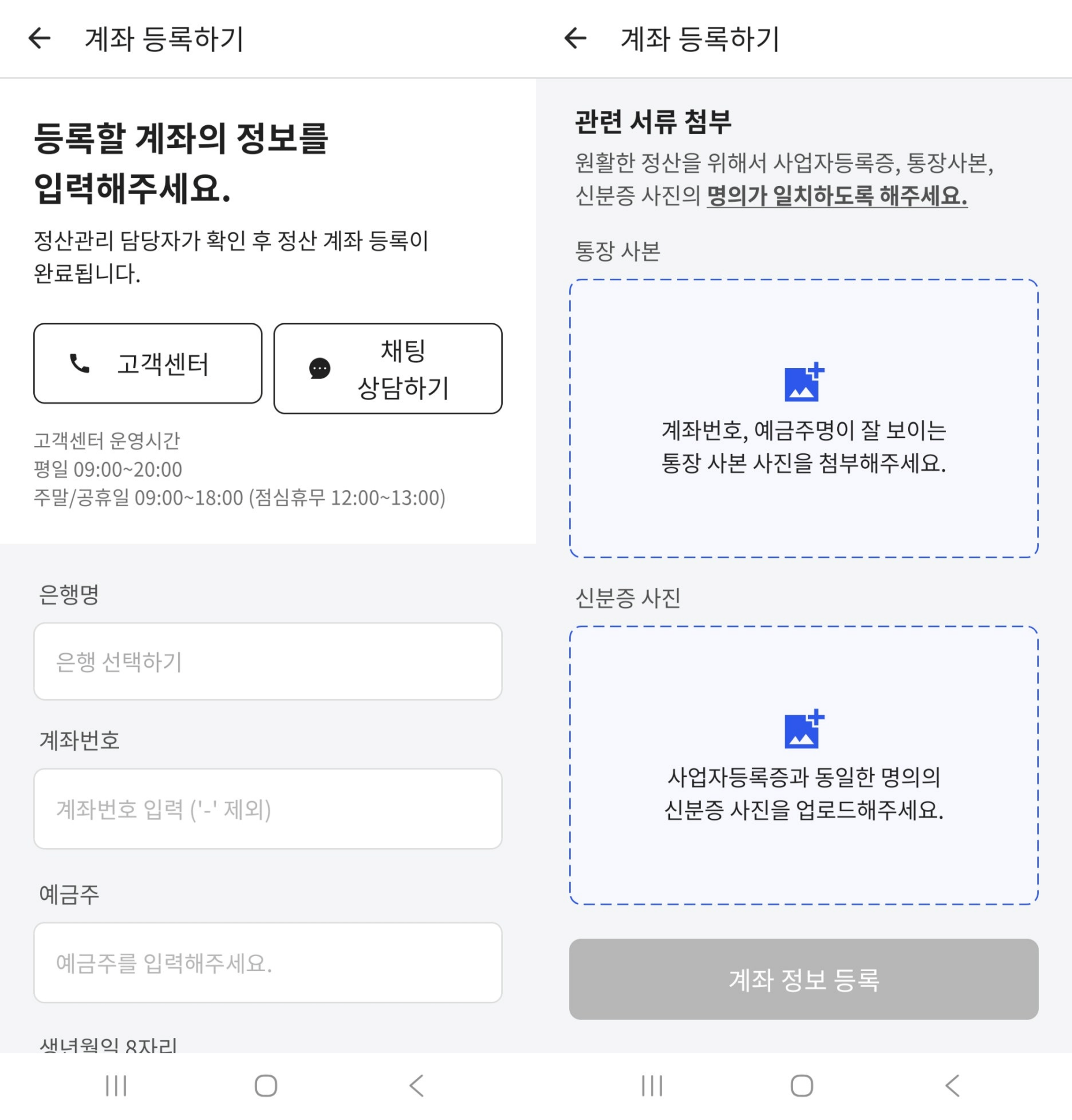 [정산관리] 페이지의 [계좌 등록하기] 버튼으로 들어가셔서