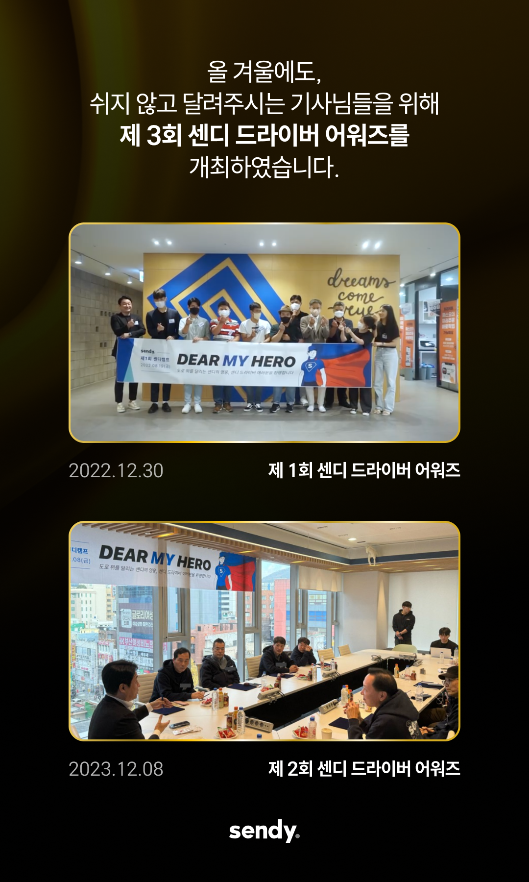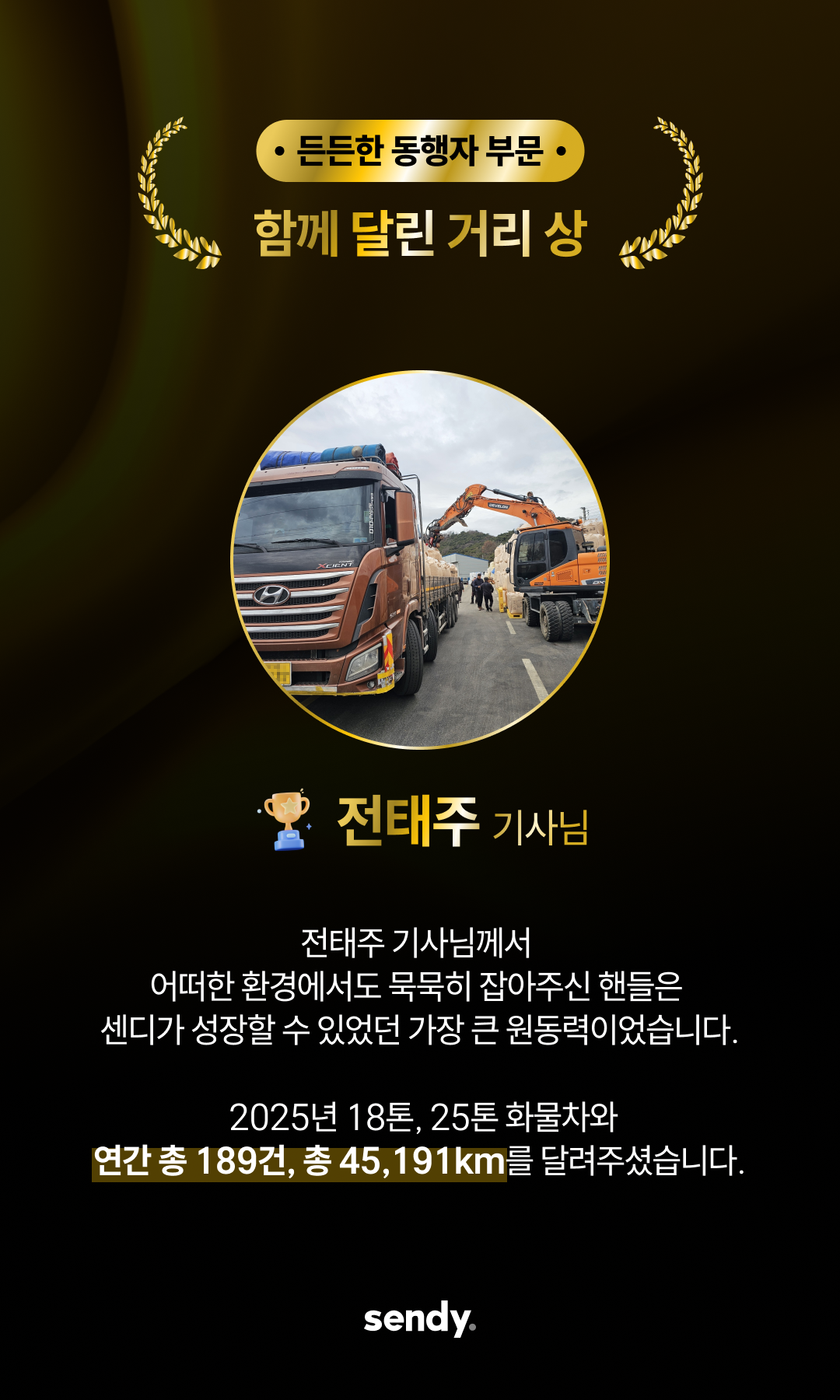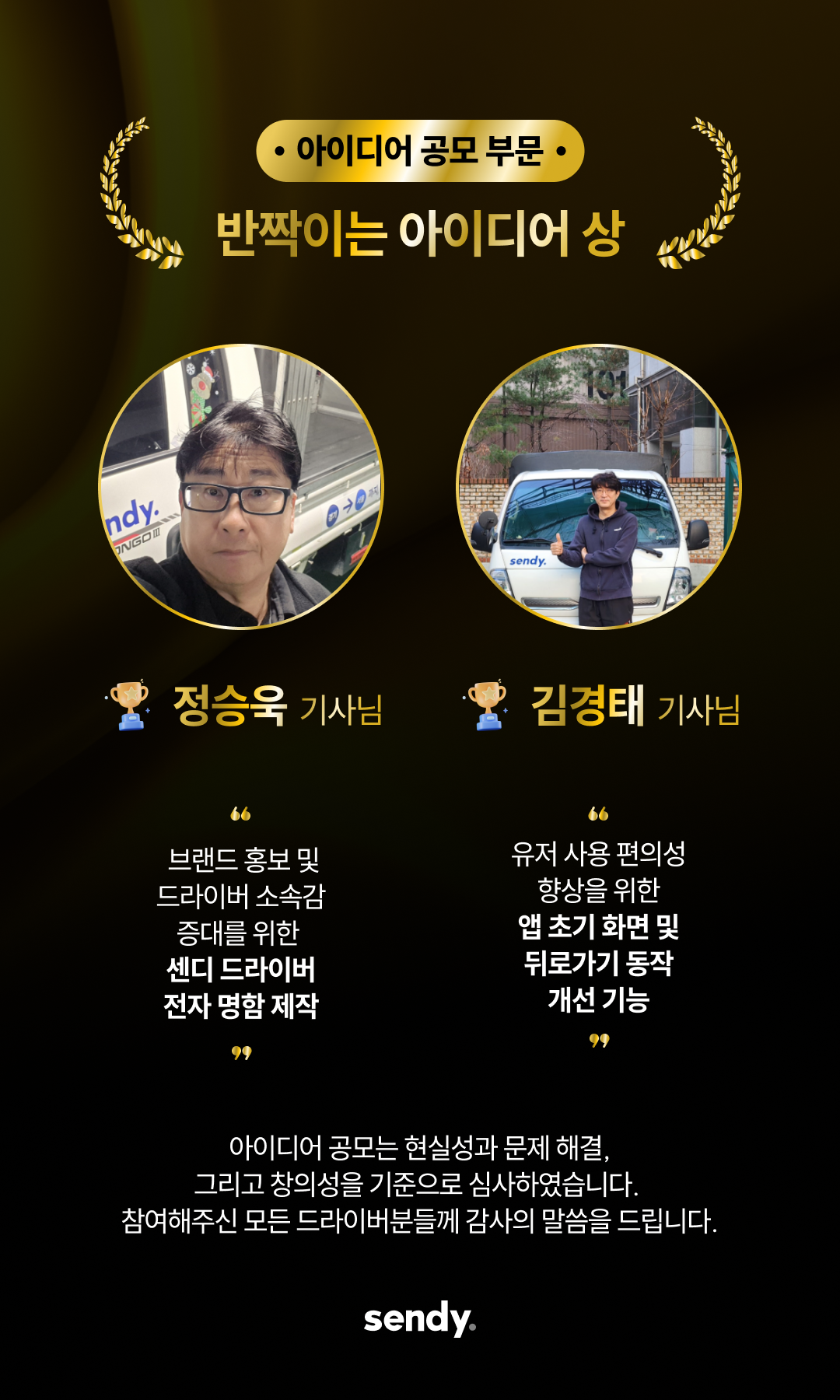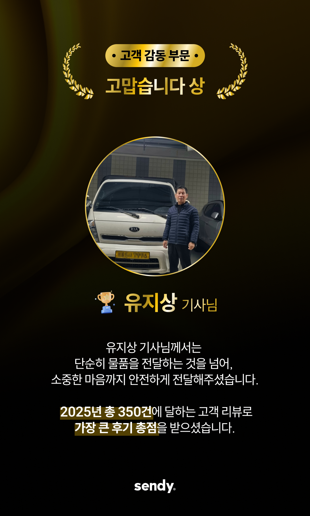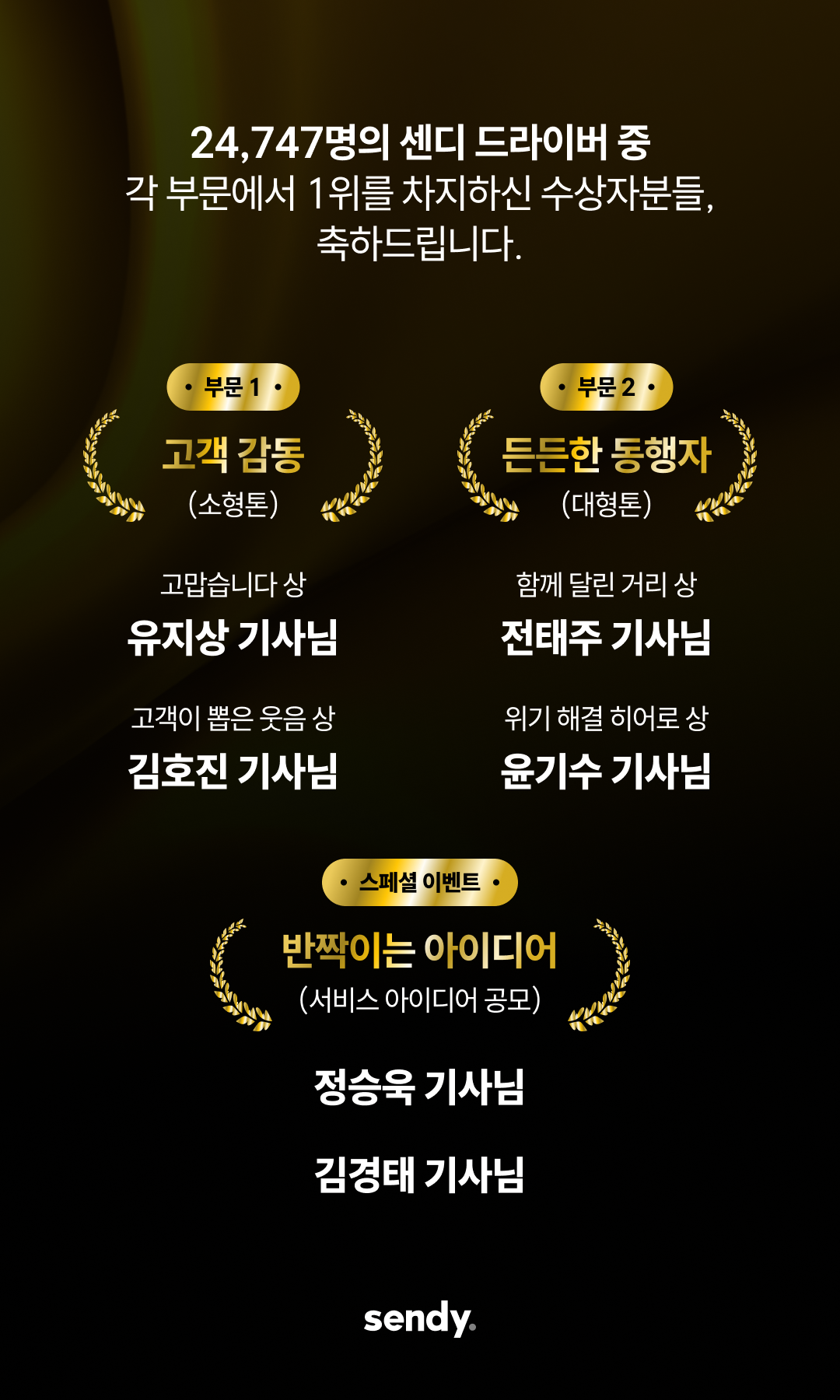 이번 어워즈는 2025년 한 해 동안 센디와 함께 전국 각지를 누비며, 현장에서 탁월한 책임감과 친절, 그리고 프로의식을 보여주신 기사님들을 선정하여 그 노고에 감사를 표하는 자리로 마련되었습니다.
