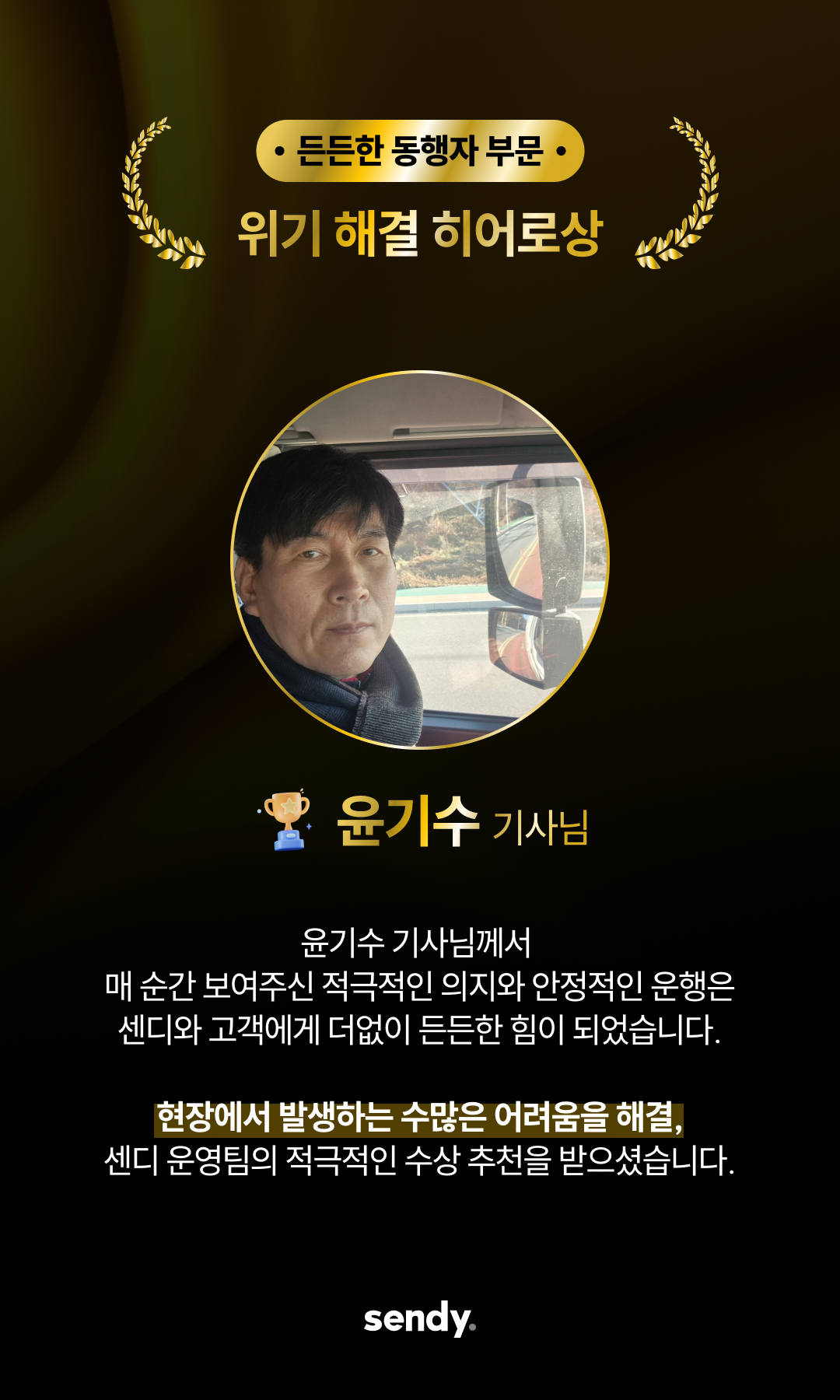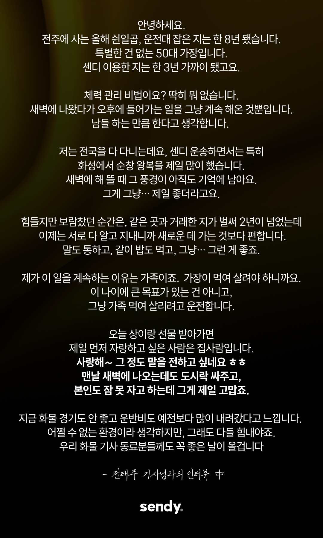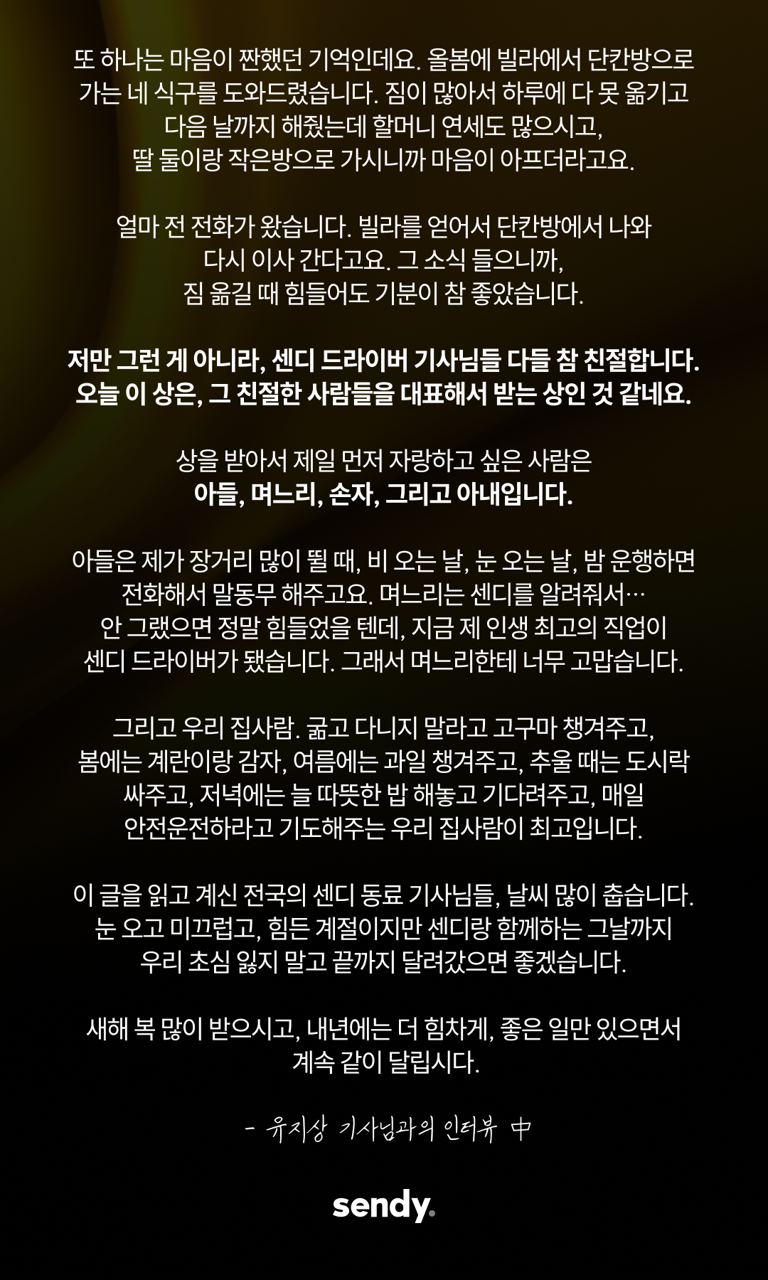 추운 새벽과 궂은 날씨 속에서도 운전대를 놓지 않으셨던 기사님들의 노고를 잊지 않겠습니다. 더 안전하고 공정한 환경을 약속드리며, 센디 염상준 대표이사가 감사의 마음을 전합니다.