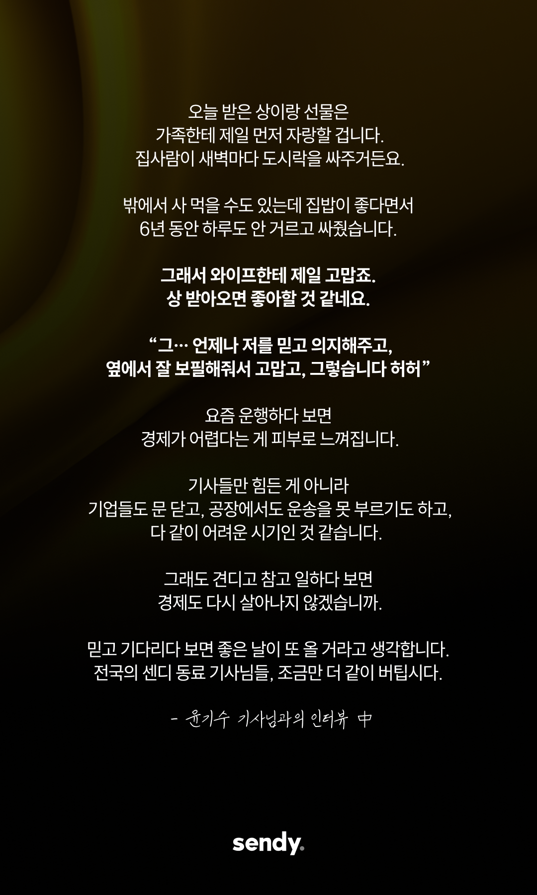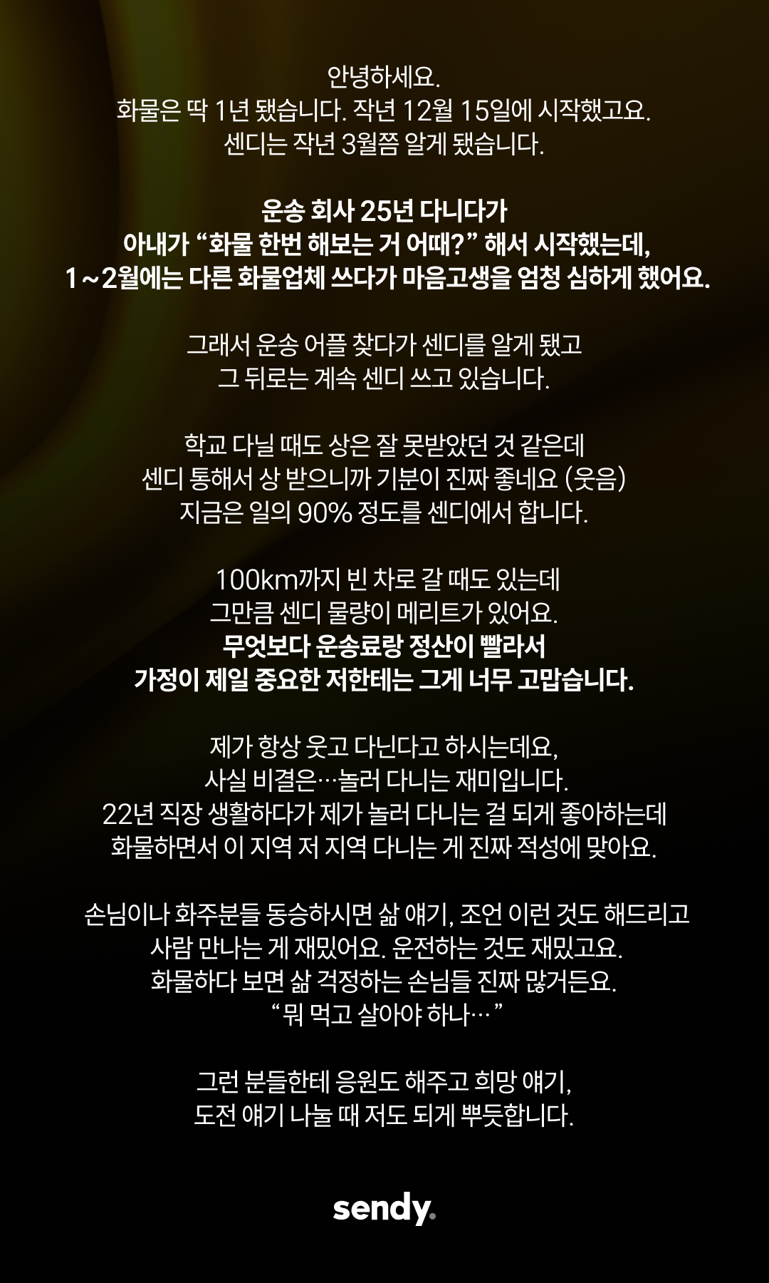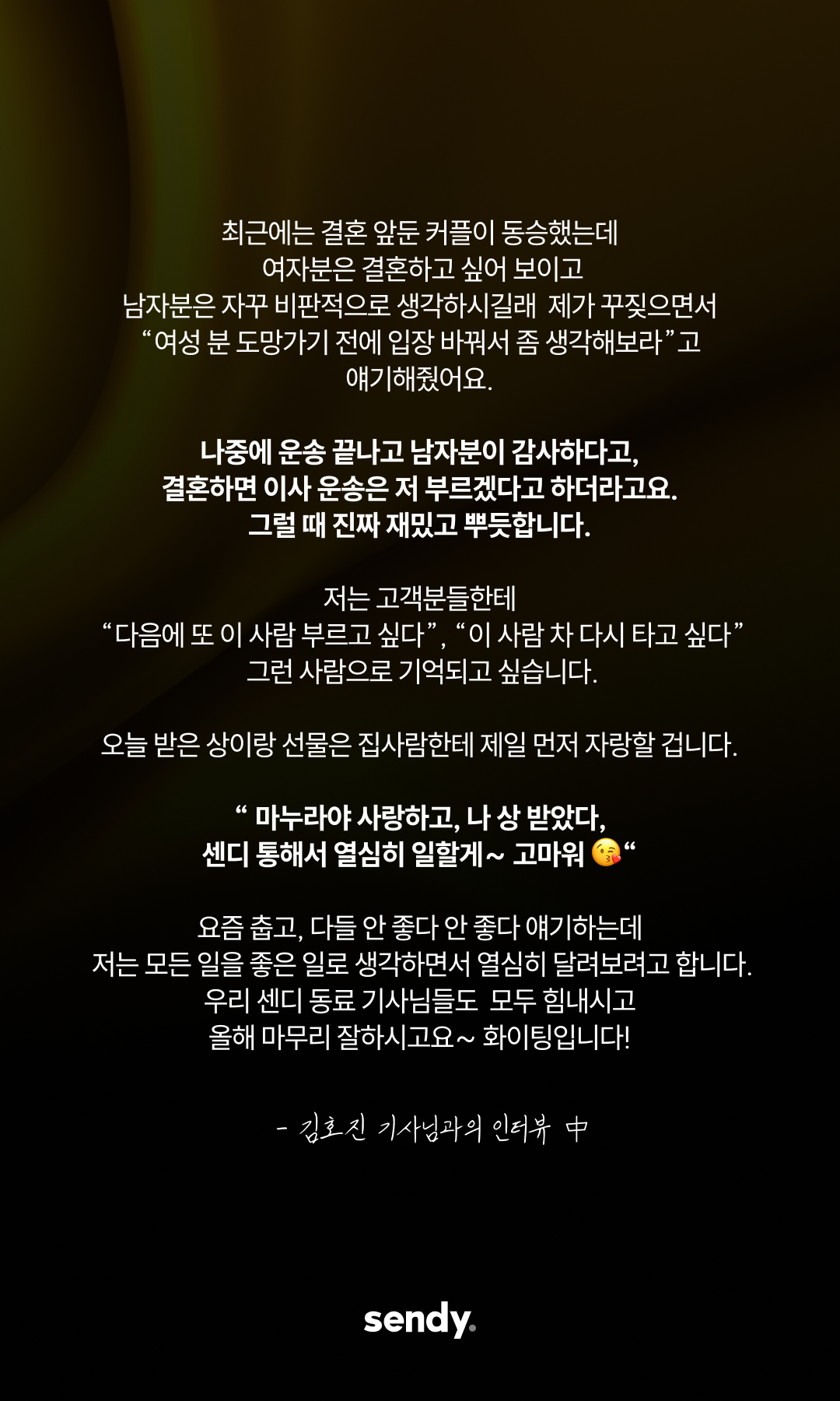추운 새벽과 궂은 날씨 속에서도 운전대를 놓지 않으셨던 기사님들의 노고를 잊지 않겠습니다. 더 안전하고 공정한 환경을 약속드리며, 센디 염상준 대표이사가 감사의 마음을 전합니다.