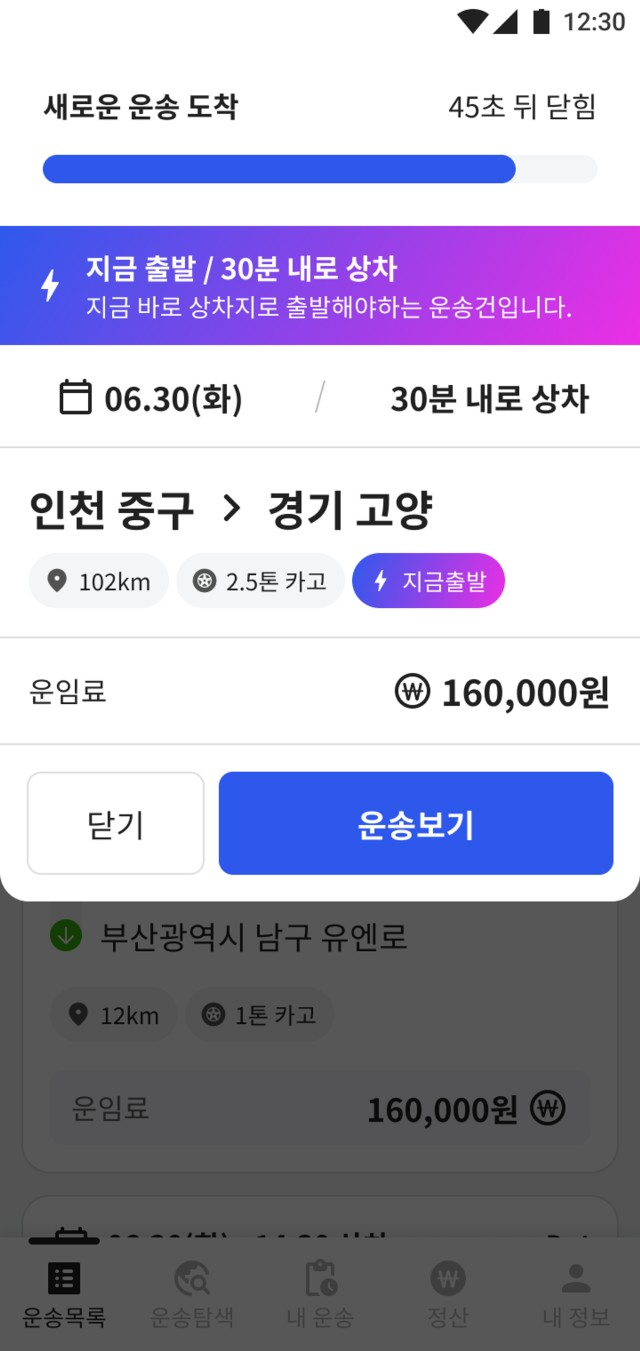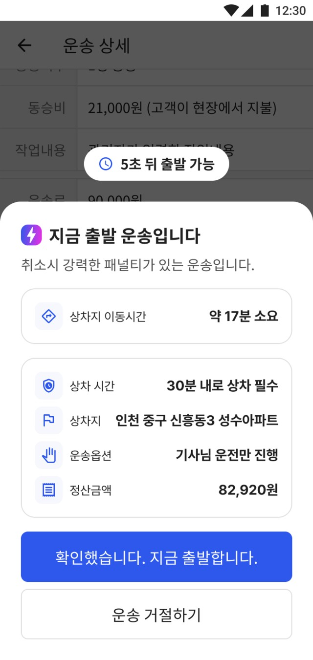 1. 지금 바로 운송이 필요한 고객과 매칭되어, 운송 수락 후 바로 출발해야 하는 실시간성 운송