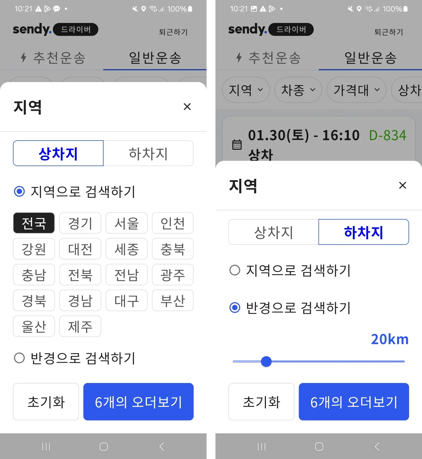 [상세 필터 - 지역] 지역과 반경으로 상/하차지를 검색할 수 있어요.