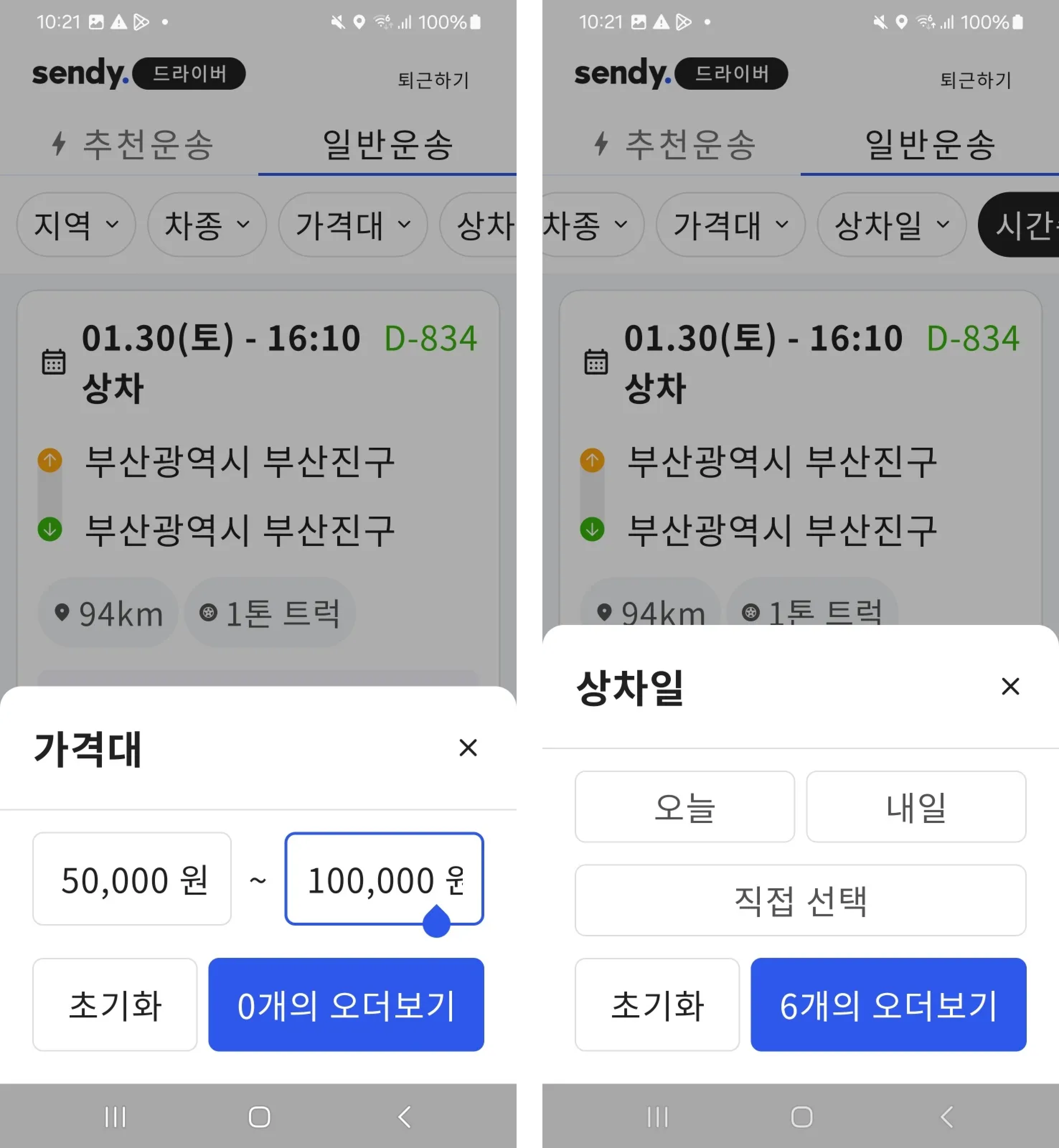 [상세 필터 - 상차일] 오늘 / 내일 / 특정 날짜로 검색할 수 있어요.