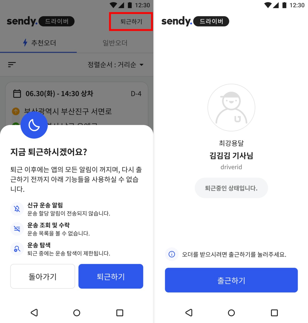 \#1 드라이버 앱 상단에 '퇴근하기'가 표시됩니다.