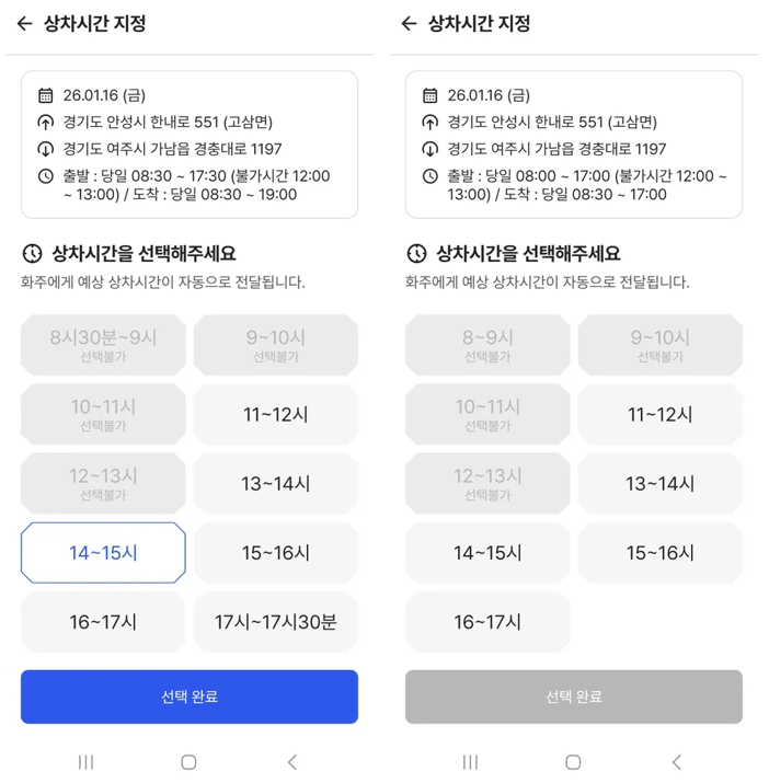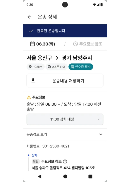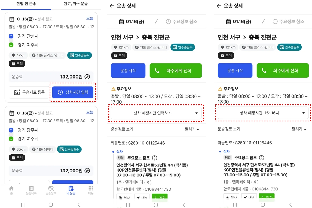 3. 드라이버님이 선택한 시간은 운송 상세 화면에 확인 가능합니다.