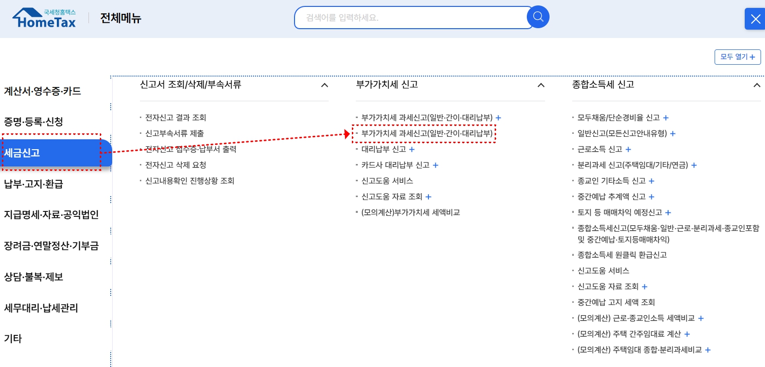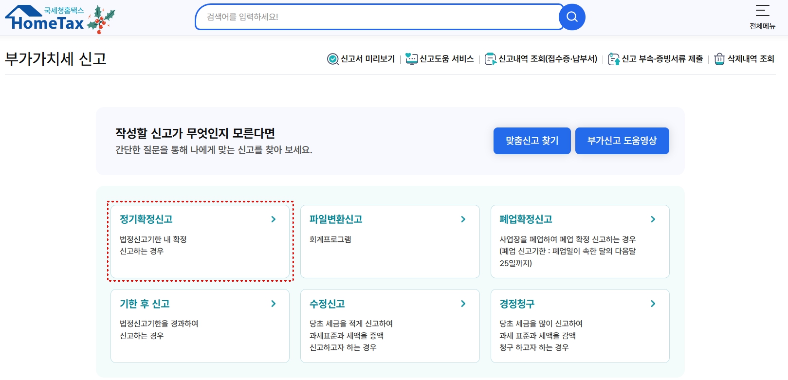 조회경로 : 전체메뉴 > 세금신고 > 부가가치세 과세신고(일반·간이·대리납부) > 정기확정신고